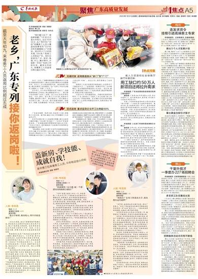 目前,佛山人社部门还积极组织“点对点,一站式”返乡返岗接送活动。各级人社部门春节前后组织专列、专车不少于10班(次),协助千余名务工人员节前返乡、节后返岗。1月31日夜间,佛山市将迎来黔东南州从江站至佛山西站、广州南站的高铁专列,预计一次性接回务工人员600人。
