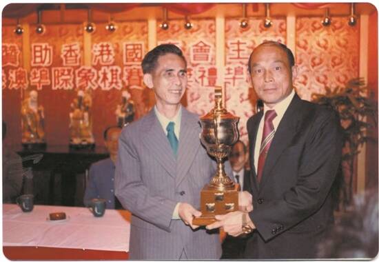 1980年第二届省港澳埠际象棋赛,广东象棋队获得冠军,霍英东颁奖给杨官璘 图/受访者供