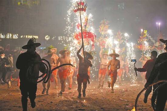 1月31日晚8时,在揭阳揭东区乔南村红龙广场,伴随锣鼓齐鸣,青年们擎着烟花火龙入场,如火红的游龙遨游天际;绚丽焰火洒向夜空,如满天星斗映照人间。
