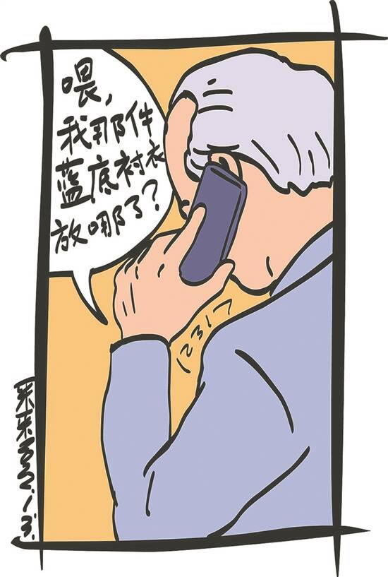 回到家,老伴不在家,老王自己打开衣柜找那件蓝底衬衣,可找了几遍也没见那件衬衣,自己的衣服都挂在衣柜里,怎么不见了呢?于是打电话给老伴: “喂,我那件蓝底衬衣放哪了?”