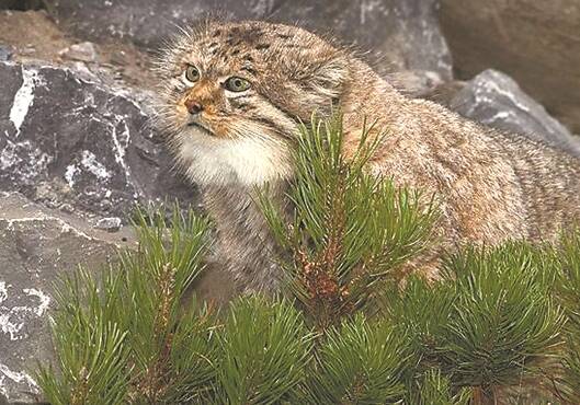 兔狲则是猫科、兔狲属的动物,体型粗短,大小似家猫,叫声也似家猫,但较粗野。兔狲的额部较宽,吻部很短,瞳孔为淡绿色,耳短宽,耳尖圆钝,两耳距离较远,全身被毛极密而软,绒毛丰厚。它们多栖息于沙漠、荒漠、草原或戈壁地区,主要分布于亚洲中部地带向东至西伯利亚,能适应寒冷、贫瘠的环境,常单独栖居于岩石缝里或利用旱獭的洞穴。它们也属夜行性动物,视觉和听觉发达,主要以鼠类为食,也吃野兔、鼠兔、沙鸡等。