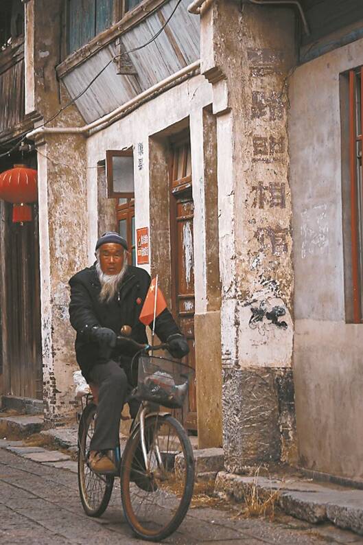 大年初六的安徽巢湖柘皋古镇,一派喜庆祥和热闹的景象。小巷的石板路上,一位白胡子老人慢悠悠骑行着,车把上插着的国旗鲜红灿烂。