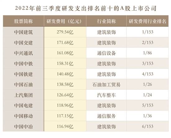 从个股情况来看,2022年前三季度A股共有134家上市公司研发支出在10亿元以上,相比2021年增加了22家。若将研发支出范围进一步扩大,共有12家上市公司研发支出超百亿元,其中,中国建筑以279.54亿元高居榜首,中国交建、中兴通讯则分别以171.68亿元、161.08亿元位列第二、第三位。整体数量与2021年相比新增5家,分别为中国电建、中国移动、中国中冶、比亚迪、宁德时代。