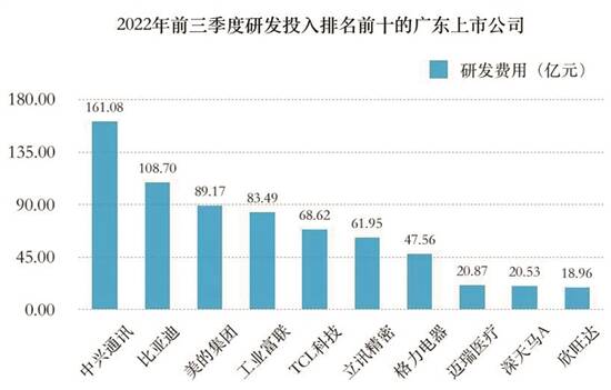 从具体行业来看,包括通信设备、汽车整车、白色家电、消费电子、医疗器械等在内的多个广东发展优势行业表现亮眼,并体现出明显的城市经济发展特征。如通信设备、新能源、电子产业高度发达的深圳,辖区内龙头企业中兴通讯、比亚迪、工业富联、迈瑞医疗等均为研发投入“大户”,致力于通过科技创新带动行业发展。