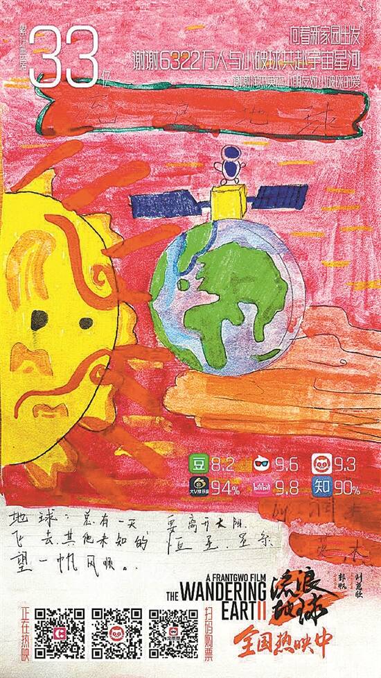 2月5日下午,电影《流浪地球2》官方微博发文庆祝影片票房破33亿元,并发布两张票房海报,其中一张为儿童手绘海报。微博配文:“感谢6322万人与小破球共赴宇宙星河!谢谢润杰和英杰小朋友对小破球的爱。太阳对地球发起高温攻击,‘领航员号空间站’出动!带着地球飞向新家园。”