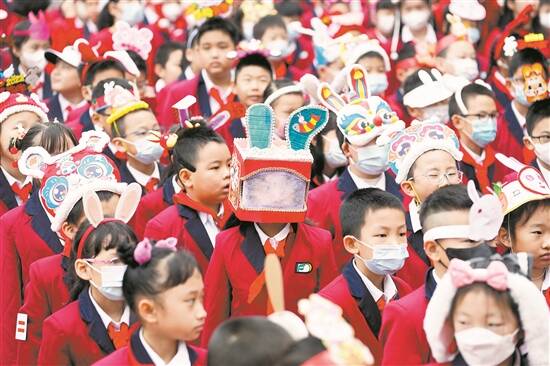 东风东路小学为学生布置了返校“作业”:戴兔年头饰。当日一大早,“小兔子”们蹦蹦跳跳地走进校园。学生们的头饰各不相同,有的学生戴了动画角色“玲娜贝儿”头饰,有的写着“兔年快乐”“‘兔’飞猛进”等祝福语,有的用围巾制作了创意头饰,还有的干脆用纸剪出一只兔子然后自己上色。小小一个头饰,给予了孩子们极大的想象和发挥空间。