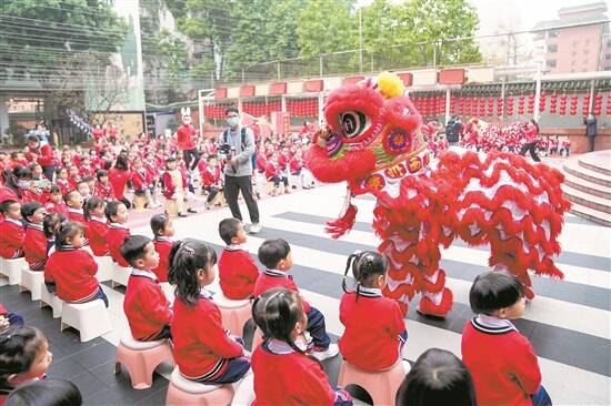 广府庙会“搬”进校园。2月6日,在广州市越秀区珠光路小学的开学典礼上,学校邀请了广府民间舞狮传承人现场展示舞狮,与学生面对面介绍舞狮文化,手把手指导舞狮技法。狮子的闪转腾挪间,将新春的福气带到学校、送给师生。