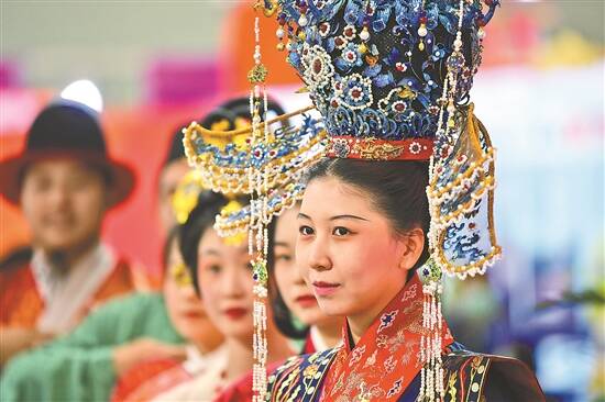有文化“广交会”之称的广州文交会,积极推动数字文化产业发展、文化旅游融合。图为文交会上的“华夏霓裳美”汉服主题走秀,身着蓝色锦纹华服的年轻人,凤冠霞帔,惊艳了时光 羊城晚报记者 邓勃 曾育文 摄 (资料图片)