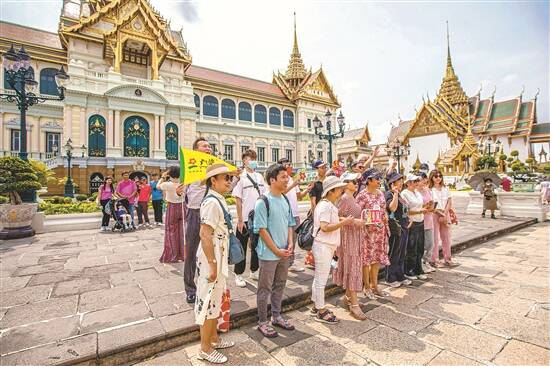 首团中国游客在曼谷大王宫景区合影 新华社记者 王腾 摄