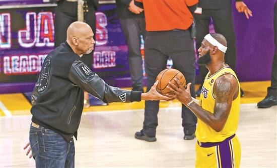 贾巴尔(左)祝贺詹姆斯打破纪录 新华社发