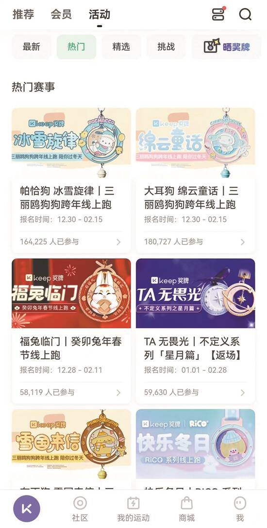 打开Keep,点击顶部的“活动”按钮,就进入了奖牌比赛页面。记者随机选择了一款名为“帕恰狗”跨年线上跑的热门赛事,显示目前已有超16万人参加,报名时间是去年的12月30日至今年的2月15日,点击进入后,大幅帕恰狗奖牌图片几乎占去了屏幕的三分之二,底部绿色的“马上报名”按钮显得格外醒目。