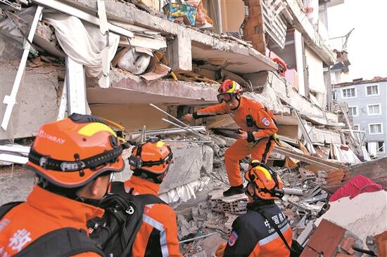 中国救援队队员在土耳其哈塔伊的一处地震废墟搜救 新华社发