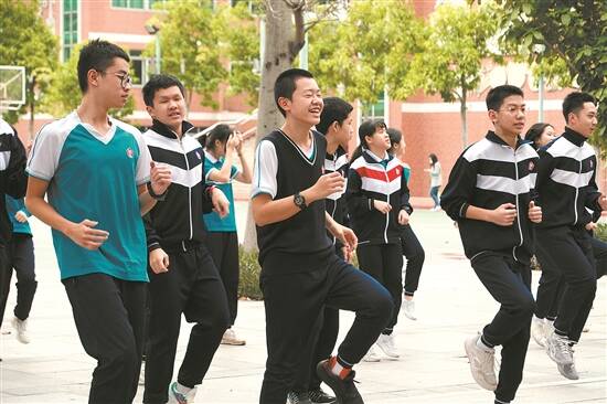 ◀▲广州市第五中学初三11班的学生正在上体育课 羊城晚报记者 秦小杰 摄