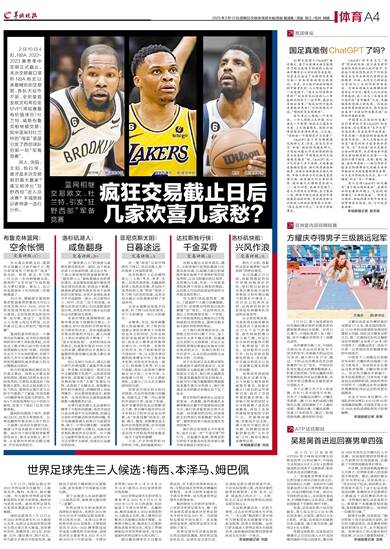 2月10日4时,NBA 2022-2023赛季季中交易正式截止。本次交易窗口堪称NBA有史以来最精彩的交易期,各队大动作不断,全明星首发欧文和两位前MVP(常规赛最有价值球员)杜兰特、威斯布鲁克相继被交易;其中篮网对杜兰特的“甩卖”更是引发了西部球队的新一轮“军备竞赛”。