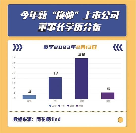 从63位新任董事长的年龄分布来看,最主要为70后,占比达49%,此外,还有11家公司迎来80后董事长,2家公司迎来90后董事长;从学历背景来看,新任董事长基本为本科以上学历,其中,32位为研究生学历,5位为博士生学历。