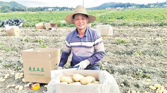 近日,惠州惠东县稔山镇五配村百亩连片冬种马铃薯示范基地里热闹不已,揭膜、分级拣果、装箱、打包、称重、上车,农户们忙得不亦乐乎。
