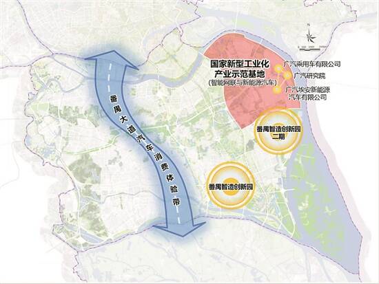 “一基地”为国家新型工业产业示范基地(智能网联与新能源汽车),这是番禺区打造智能网联与新能源汽车自主品牌创新高地的核心区域。总体规划面积55平方公里,位于番禺区东北部,横跨化龙镇、石楼镇,东至狮子洋,南至莲花大道,西至京珠高速、新化快速,北至珠江主水道,是广州汽车自主品牌“广汽传祺”“广汽埃安”的主要发展载体和产业创新中心。