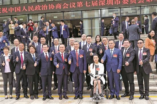 深圳市政协委员在会场外合影,一起为深圳加油点赞 羊城晚报记者 王磊 摄