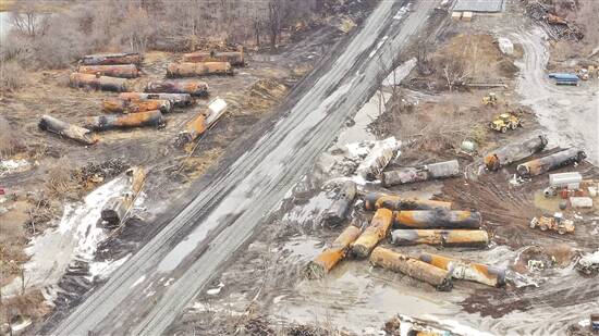 当地时间2月9日,美国俄亥俄州运载化学品列车脱轨后,清理工作持续进行 视觉中国供图