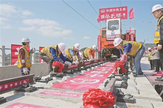 羊城晚报讯 记者李志文、通讯员吕翀报道:2月23日11时许,在广东省汕尾市广汕高铁东冲特大桥铺轨施工现场,施工人员操纵着铺轨机组将最后一组500米长钢轨安全平稳铺设到位。这标志着广汕高铁全线正线轨道铺设圆满完成,为全线按期联调联试奠定了坚实基础。