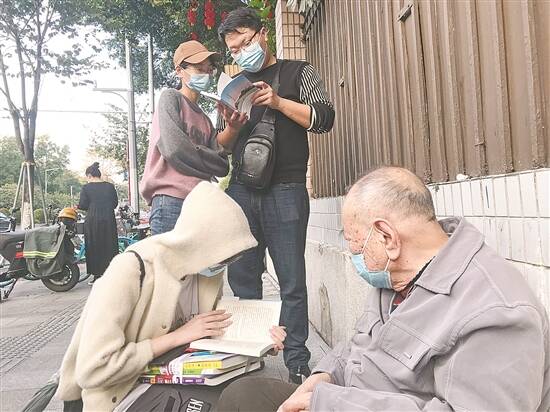 林宝山(右)的小书摊吸引了不少年轻人的关注