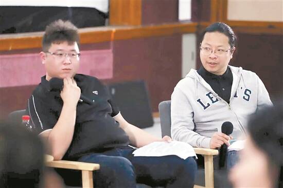电影《流浪地球》编剧严东旭(右)、电影《流浪地球2》特殊道具制作方田顺 图/潘若帆
