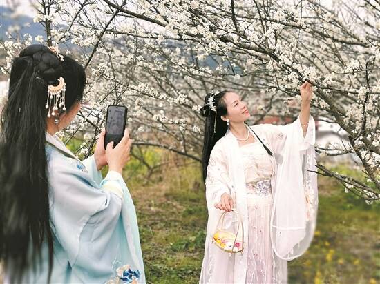 在九峰镇的环镇路口、桃子园、茶料等地,随处可见游客三五成群观赏桃李花的身影。来自珠海的程女士表示:“乐昌的花海好美,我带上了外地的好朋友,我还和她们介绍,到了水果丰收的时候,这里的黄金柰李、鹰嘴桃也很甜。下次来我们打算住这里的民宿。”