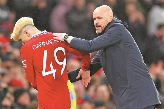 曼联主教练滕哈格(右)鼓励“板凳球员”加纳乔 图/视觉中国