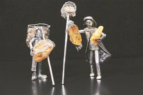 展品中有一件有趣的银镶琥珀雕塑《琥珀采矿工》,生动而巧妙地呈现出波罗的海早期的“渔夫”们打捞琥珀时的工作画面。早在16世纪开始,世界上盐度最低的波罗的海及附近区域,就有一些专门在海面寻找琥珀的“渔夫”,他们会用抄网在海面捞取那些因地质运动而漂浮在水面或沉积在浅水区水底的琥珀。因为琥珀的密度通常在1.05-1.09克/毫升,而水的密度是1克/毫升,所以琥珀在普通的水中是漂浮不起来的,但在密度较大的海水中,琥珀却是可以浮出水面的。