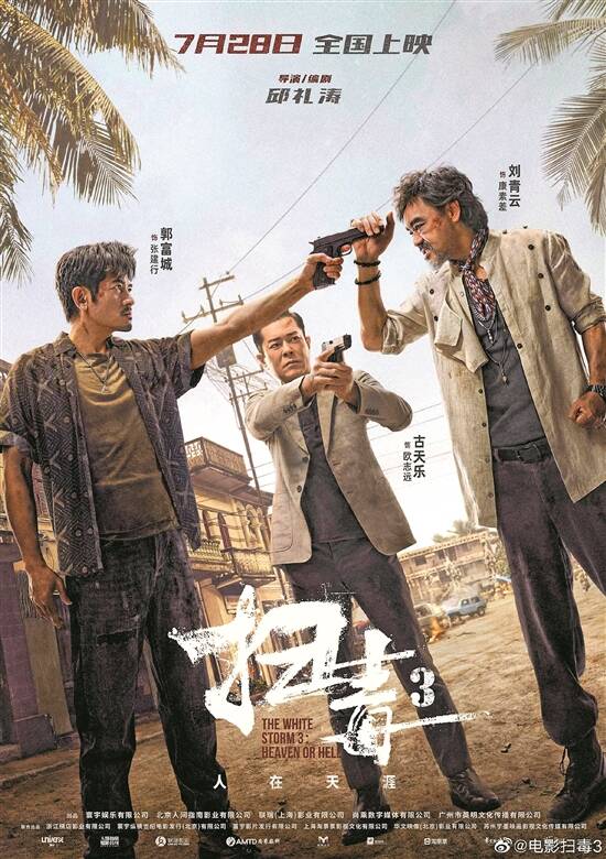 《扫毒3:人在天涯》由邱礼涛执导,讲述毒枭大佬在香港的贩毒生意被警方查处后,带团队逃到金三角发展,却意外发现身边藏有卧底的故事。刘青云扮演毒枭康素差,他一直带着手下张建行(郭富城饰)从事毒品交易,新加入的成员欧志远(古天乐饰)也因一次意外与两人有了过命交情。故事发生地设置在泰国、缅甸、老挝交界处的著名“金三角”地带。在定档海报中,三人在危机四伏的“金三角”街头,郭富城神色凶狠地持枪直抵刘青云额心,但刘青云面无惧色并与其怒目相视,直接用手紧握枪管。而古天乐站在两人之间,神色凝重举枪瞄准刘青云,剑拔弩张的焦灼氛围一触即发。
