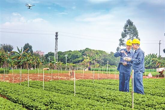 南方电网广东东莞东北区供电局运维人员前往常平镇横江厦村,为农田周边供电线路开展无人机巡视检查 张新城 摄