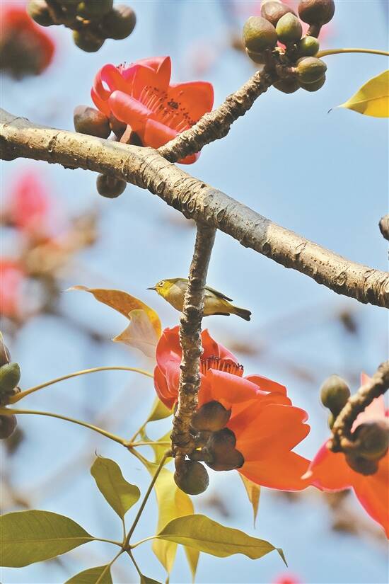 走进中山纪念堂、越秀公园、烈士陵园等广州市区的木棉花观赏点,抬眼望去,木棉正“抖擞”着精神,酝酿出花蕾,盛开在枝头。在人潮涌动的街头,在高高低低的枝丫,一株株红棉竞相开放。春风拂过,一声声鸟鸣适时到来。盛开的木棉花引来鸟儿落下,红耳鹎鸟在花间飞舞,暗绿绣眼鸟在枝头嬉戏。
