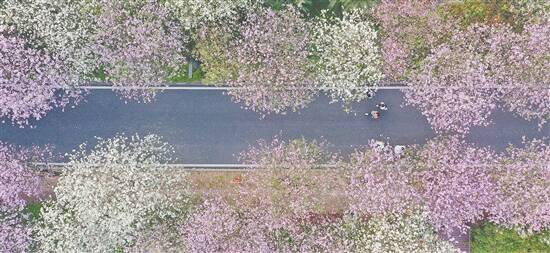 临江大道与广州大道交界处,16棵紫花风铃木构建春天童话长廊 何奔 摄