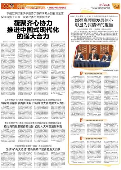 3月6日,十四届全国人大一次会议广东省代表团举行小组会议,审议政府工作报告(以下简称“报告”);全国政协十四届一次会议举行小组会议,讨论政府工作报告。来自广东的全国人大代表、政协委员围绕高质量发展、民生福祉等话题,建真言、献良策、促发展。
