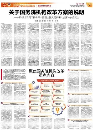 这次国务院机构改革,重点是加强科学技术、金融监管、数据管理、乡村振兴、知识产权、老龄工作等重点领域的机构职责优化和调整。代表委员们表示,改革方案有利于转变政府职能,加快建设法治政府,为全面建设社会主义现代化国家、全面推进中华民族伟大复兴提供有力保障。