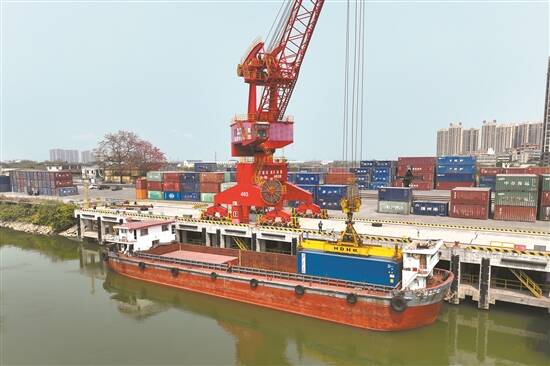 羊城晚报讯 记者王雷、通讯员石龙宣摄影报道:记者从东莞市石龙镇获悉,3月8日,一批载有工业原料的集装箱在东莞石龙港办结海关通关手续后装上驳船“华海238”起运,在运抵南沙港后直接搭乘国际货轮出口至约旦,这标志着东莞石龙——广州南沙“湾区一港通”正式启动。