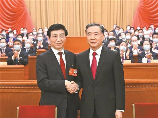 3月10日,全国政协十四届一次会议在北京人民大会堂举行第三次全体会议。当会议主持人宣布王沪宁当选政协第十四届全国委员会主席后,汪洋起立祝贺,与王沪宁热烈握手 新华社发