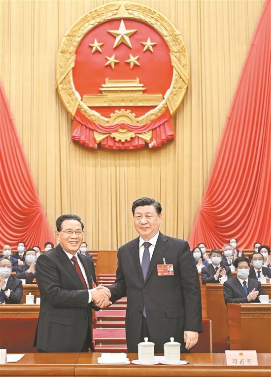 在主持人宣布李强同志为中华人民共和国国务院总理后,全场响起热烈的掌声,李强起身向代表们鞠躬致意。随后,他转向习近平,两人亲切握手,习近平向他表示祝贺。李强又同李克强同志握手,相互致意。