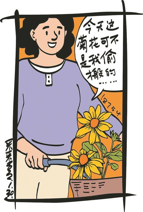到了晚上彩票开奖,老肖发现,自己的彩票又中奖了!老肖兴奋不已,他心想:“这人还真不能做坏事,搬自己喜爱的菊花也要正大光明才行。”(夏红军)