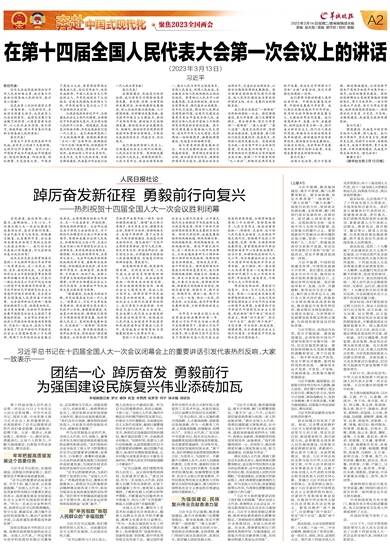 第十四届全国人民代表大会第一次会议13日上午在北京人民大会堂闭幕。中共中央总书记、国家主席、中央军委主席习近平在会上发表重要讲话。在现场聆听了总书记重要讲话的代表们备受鼓舞、倍感振奋、倍增干劲。大家一致表示,在新征程上,将团结一心、踔厉奋发、勇毅前行,以每个人的努力,不断为强国建设、民族复兴伟业添砖加瓦、增光添彩。