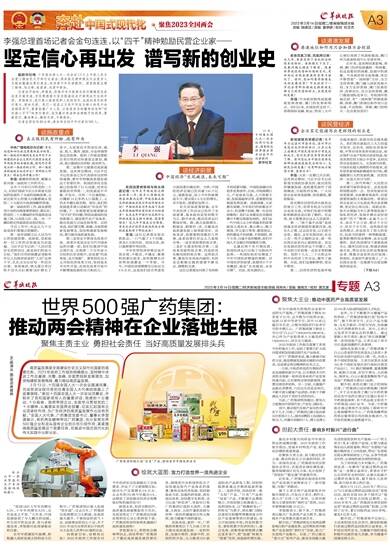 李楚源表示,将把两会精神带回去,团结带领广药集团上下锚定高质量发展首要任务,围绕党中央和国务院关于加快建设现代产业体系的部署,聚焦实体经济发展,坚持制造业当家,加强科研创新,深化国企改革,加快数字化转型,全力以赴“拼经济”,争取早日将广药集团打造的大南药、大健康、大商业、大医疗蓬勃发展为世界一流医药健康综合性大集团,助力健康中国的建设。