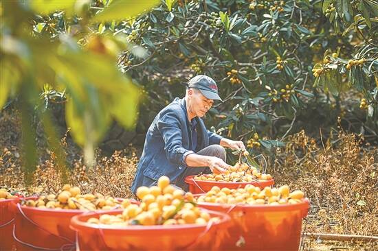在建城镇白天村的天马山,漫山遍野的枇杷树上挂满果。基地中,一株株枇杷树沿着山脊错落有致地分布着,枝头上挂满了大小不一、青黄相间的果实,十分惹人喜欢。村民在林间忙着采摘,色泽金黄的枇杷个头大如鸡蛋,让人垂涎欲滴。