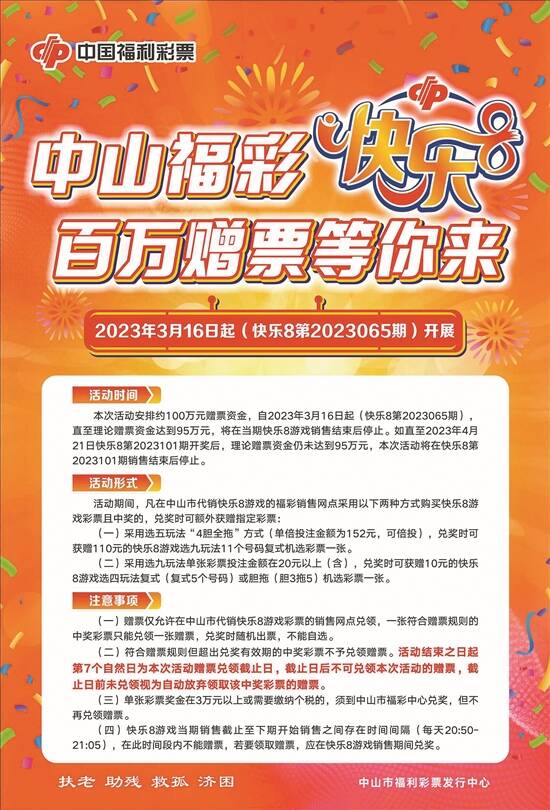 为进一步扩大快乐8游戏品牌影响力,营造良好的市场氛围,促进中山市快乐8游戏销售稳步发展。中山市福彩中心于3月16日起(快乐8第2023065期)在全市范围内开展“福彩快乐8,百万赠票等你来”活动。