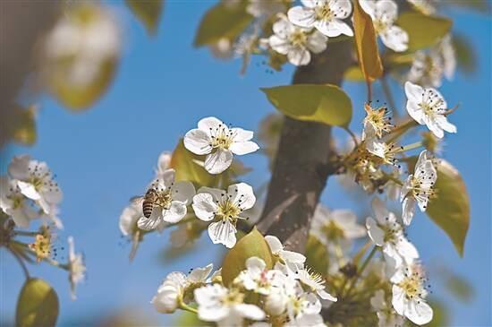 梨花盛开引来蜜蜂采蜜