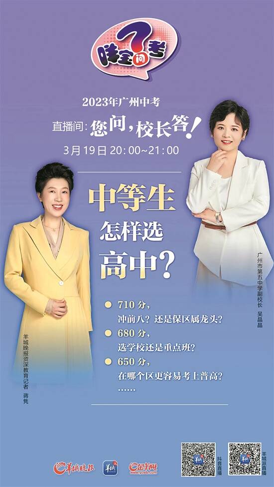 3月19日20:00-21:00,羊城晚报《咩宝问中考》推出的网络直播,邀请广州市第五中学副校长吴晶晶与家长互动讨论“中等生如何选高中”,回答家长们的提问,让经历过无数孩子升学、经验丰富的校长来给家长们出主意、当参谋。