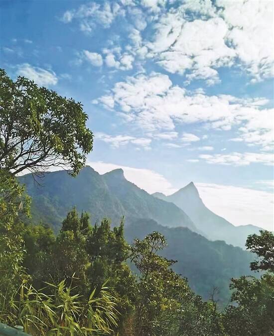远眺,尖峰山像是一个往天上长的大山尖,一侧脊背爬满绿色丛林,一侧则为大自然大刀阔斧削出来的陡峭而裸露的岩石。虽然是冬季,尖峰岭依然满目苍翠。