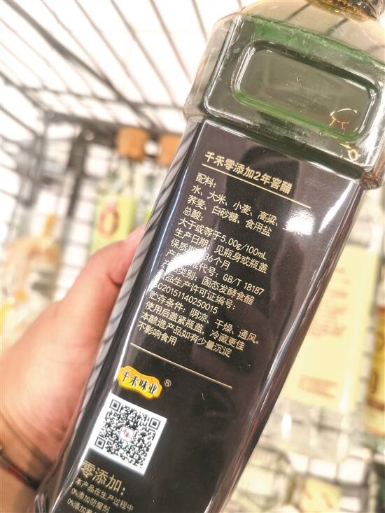 随后,记者走访了广州各大超市了解情况。走访发现,“零添加”几乎成为食醋行业的标配。千禾、海天、鲁花、金龙鱼等旗下米醋、陈醋都推出了相应产品。这些产品的共同点是,都会在标签正面,醒目标注上“零添加”或“0添加”。不标注的产品反而成为少数。有消费者告诉记者,会受“零添加”广告影响,为这类产品买单。“会让人觉得更安全、更放心。”这位消费者也透露,没有看配料表的习惯。“配料表的字很小,正面零添加的字很大,所以不会再去看小字。”