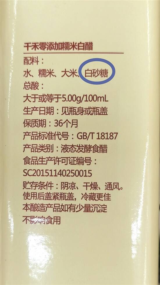 不过,一次偶然机会让她对此产生了疑问。“前天做凉拌菜时,我下意识看了一眼米醋的配料表,没想到里面竟然有白砂糖!”何女士说,有家人是糖尿病患者,平日饮食很忌讳糖分摄入。“真的不明白,我买的是醋又不是糖,‘零添加’醋里怎么会有糖?” 何女士说,在她心中“零添加”食醋应该是很纯粹的产品,不应该有白砂糖的成分。记者查看发现,何女士购买的是千禾零添加糯米白醋,标签上用大号字体标注着“零添加醋”字样。该醋配料中清楚写着含有水、糯米、大米和白砂糖,产品类别为液态发酵食醋。