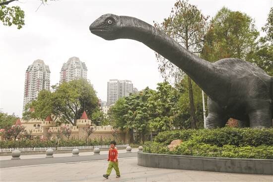 具有童话色彩的恐龙雕塑和城堡是广州动物园的标志性景观