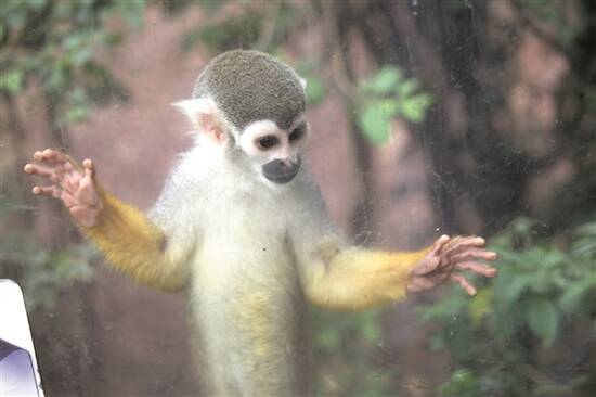 贴在玻璃屏,松鼠猴在思考“猴生”